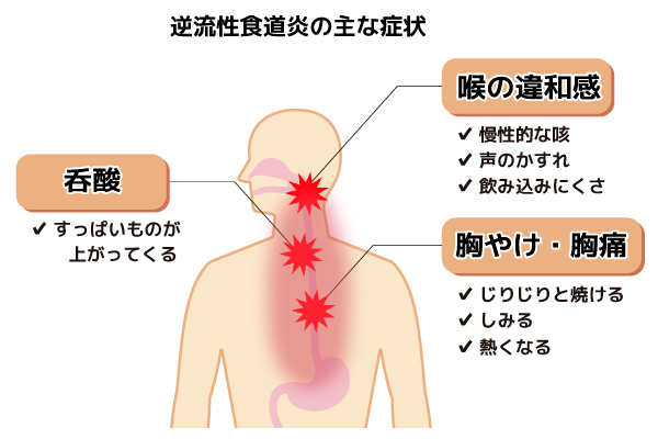 症状には、酸っぱいものが上がってくる「呑酸(どんさん)」や、みぞおちの辺りから胸にかけてじりじりと焼ける・しみる・熱くなる感じがする「胸やけ」があります。他にも、胸がつまるような痛み、喉(のど)の違和感(慢性的な咳、声のかすれ、飲み込みにくさ)などもあります。喉や咳の症状は、胃酸が喉の辺りまで逆流してしまうことで起こります。胃酸が逆流しやすい時間帯は食後2~3時間ですから、食後にこうした症状が現れる場合は、あなたの食道でも胃酸の逆流が起こっている可能性があります。