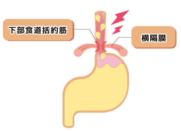 健常な状態では食事後の胃の内容物が逆流しない仕組みとして、食道と胃の境目に「下部食道括約筋」という筋肉があり、食道から胃に食物が通るとき以外はこの筋肉を締めることで、胃から食道への逆流を防いでいます。