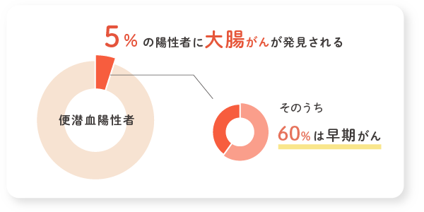 便潜血陽性者のなかで、大腸がんが発見される割合は5%と言われています。そのうちの60%ほどが早期がんです。大腸がん以外にも、切除の必要な大腸ポリープが見つかることもあります。このようなポリープを切除することで、その後の大腸がんのリスクを減少させることができます。大腸がんでは、血便などの自覚症状を認めてから医療機関を受診した方の約80%が進行がんと言われています。ですから、無症状でも便潜血陽性となったら、医療機関を受診することが大切です。