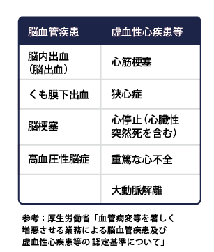 上記のような「過労」の状態を続けていると、さまざまな疾患を引き起こし「過労死」につながる可能性が高まります。