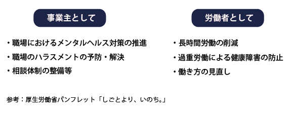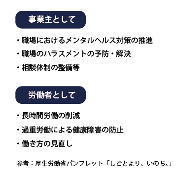 厚生労働省では毎年11月を「過労死等防止啓発月間」としてさまざまな啓発活動を行っており、「しごとより、いのち。」という啓発冊子も公開しています。