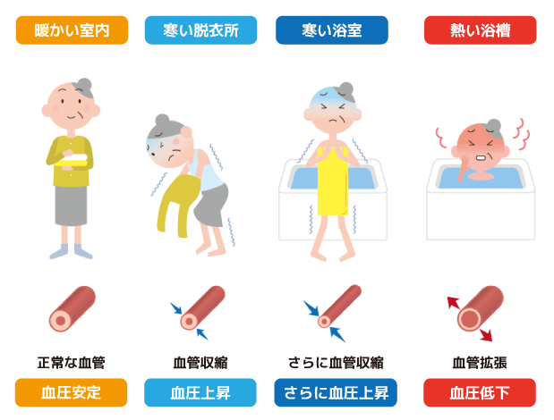 冬場、暖かい居室から寒い脱衣所へ移動することで血管は縮まり、血圧が一気に上昇します。浴室内の寒さでさらに血圧は上昇し、次に浴槽につかると体が温まり、今度は血管が拡がり血圧が下がります。このように、温度差がある場所を行き来することで血圧に急激な変化をもたらし、それが心臓や脳に大きな負担をかけてしまうのです。