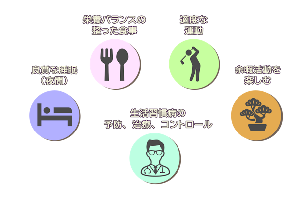 認知症の原因となる病気によって、予防の方法は異なります。現時点で、認知症を確実に予防する方法は確立されていませんが、多くの研究が進んだ結果、壮年期からのさまざまな良い生活習慣や活動に効果がある、または効果の可能性があるとして、「認知症発症およびその進行を遅らせる」ことを目的に、次のようなことが挙げられています。