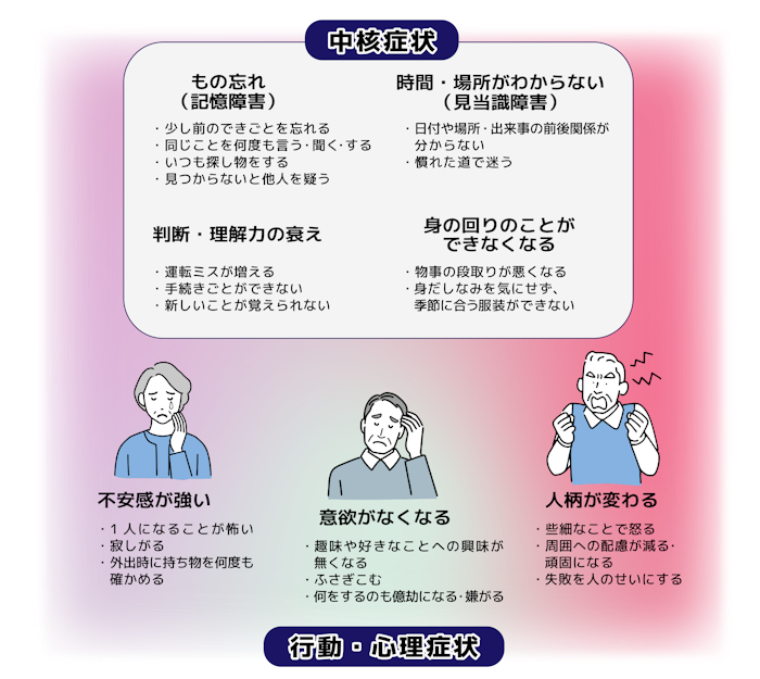 認知症が疑われる症状として、次のようなものが挙げられます。複数該当する場合は、認知症初期症状かもしれません。