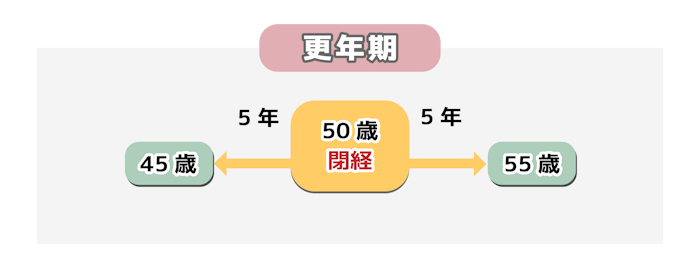 最後の月経が来てから1年間月経がなかった場合「閉経」と判断し、その前後5年ほどの期間を「更年期」と呼びます。日本人の平均閉経年齢は50歳前後といわれ、早い人は40歳前半、遅い人は50歳後半になることもあります。