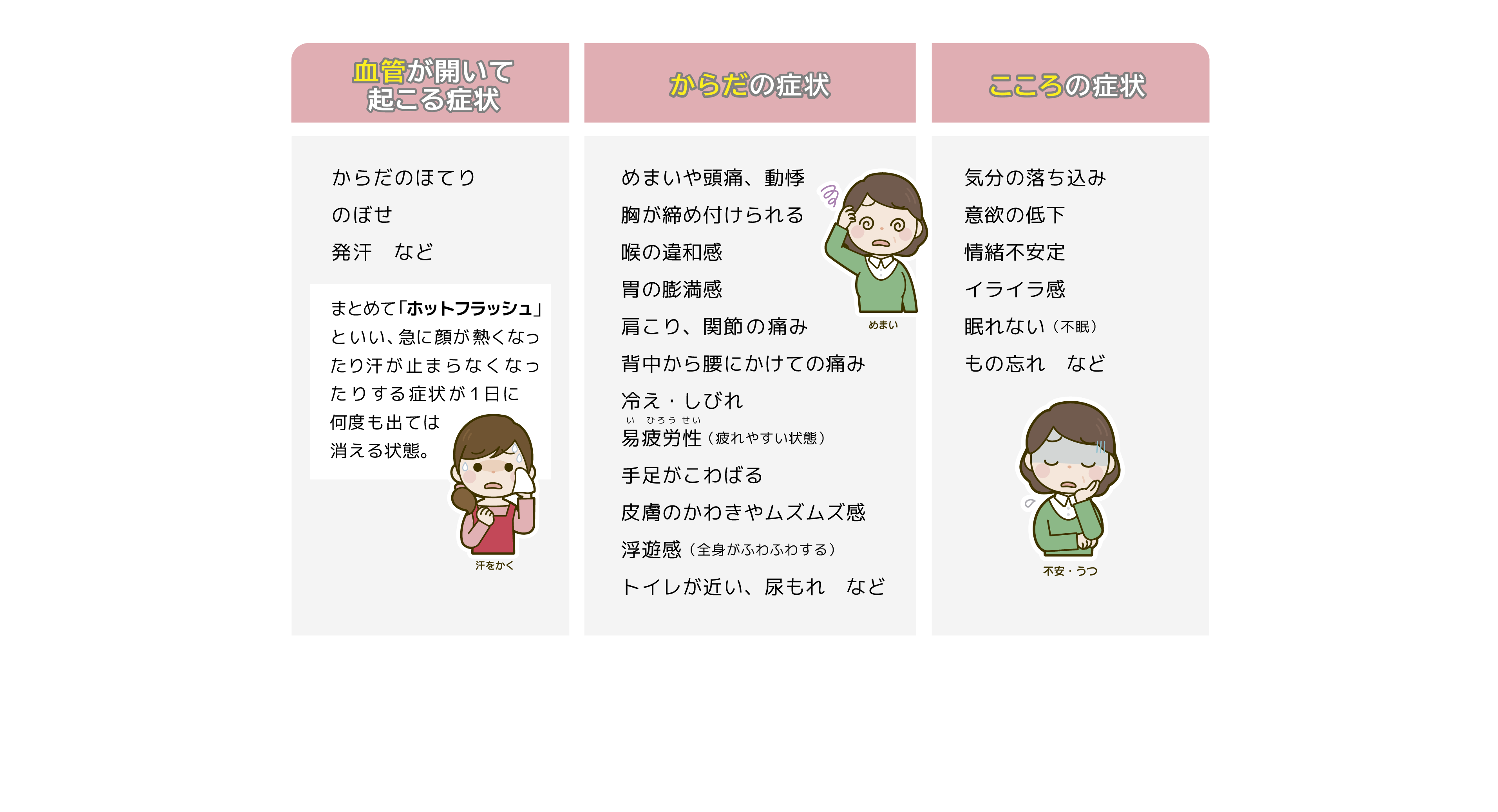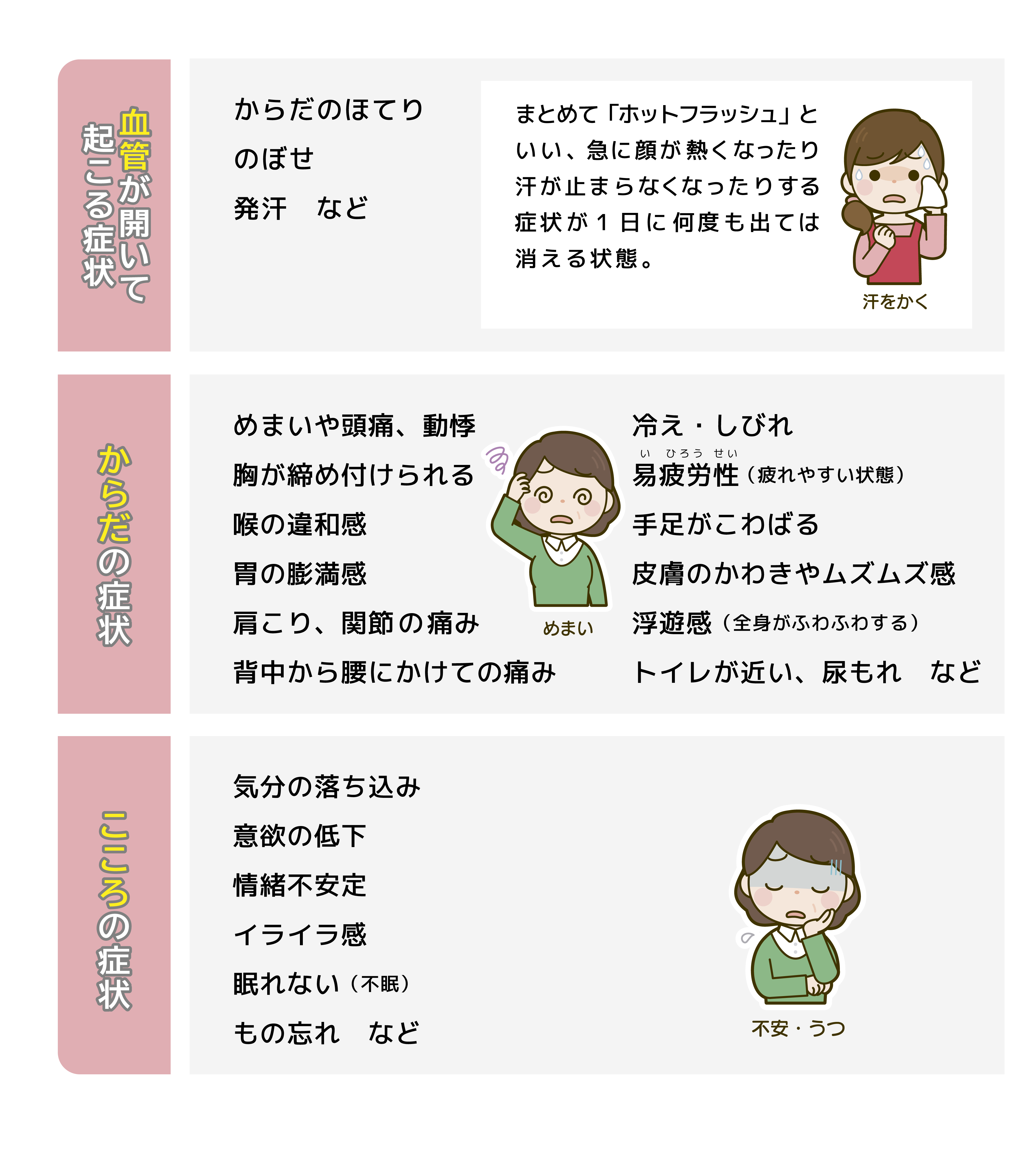 この時期は全身の機能低下や社会環境の変化とも関連する身体的、精神的な、さまざまな症状が見られます。こうした症状の総称を「更年期症状」といい、日常生活に支障をきたす場合を「更年期障害」といいます。