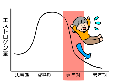 卵巣機能の低下とともに血液中の女性ホルモン「エストロゲン」の量にゆらぎが起こり、急激に低下します。