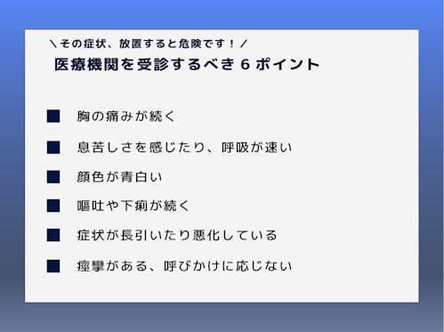 ただし、次のような症状がある場合は、すぐに医療機関を受診してください。