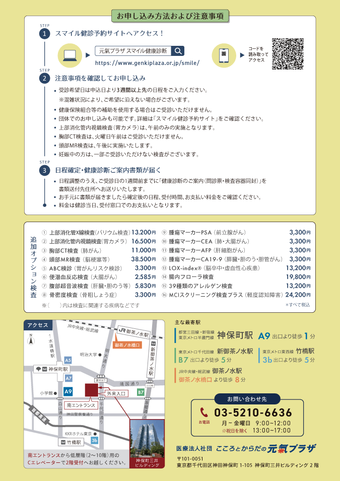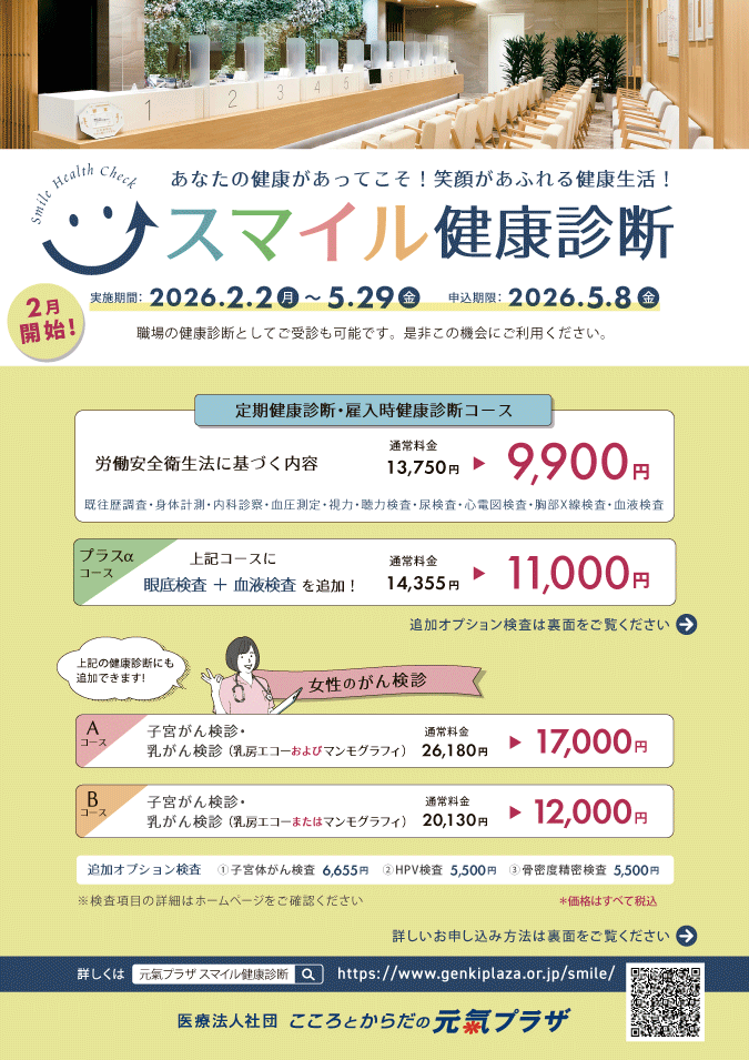 毎年ご好評いただいている「スマイル健康診断」「女性のがん検診」を今年も実施いたします。この機会に是非ご利用ください。